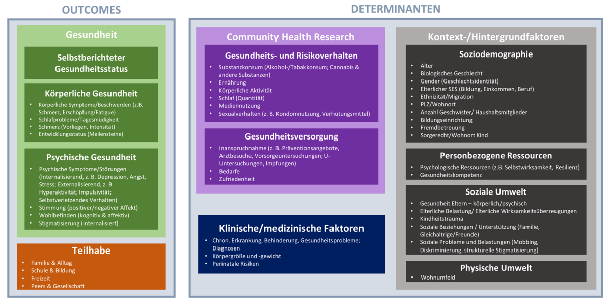 - zentrale Gesundheitsoutcomes wie körperliche (z. B. körperliche Aktivität, Schmerz), psychische (z. B. depressive Symptome, Angst) und soziale Gesundheit (z. B. soziale Unterstützung, Beziehungen zu Gleichaltrigen) und Teilhabe (z. B. Schulbesuch, Freizeitgestaltung)